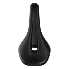 A mountain bike specific e-bike saddle for men. Longer periods of sitting, steeper uphills and greater levels of impact characterize the E-MTB experience. After intense development, the optimal saddle shape was found. The rear ramp supports the rider in steep uphill-riding situations while seated. The saddle contours facilitates the change to the downhill position when riding behind the saddle. The V-shape also offers freedom of movement across the wide flanks up to the padded nose – important for particularly steep climbs. Maximum comfort for men and women – there are huge anatomic differences between men and women when it comes to seated ergonomics. Ergon has designed the relief surfaces according to the latest in scientific knowledge and extensive testing. The results are gender specific shapes of relief channels – effectively avoiding pressure spikes and preventing numbness or related discomfort.